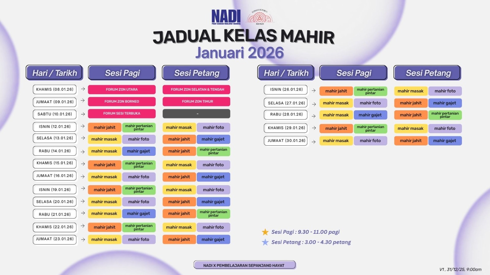 Tarikh : 26 Disember 2025 Masa : 3.30 ptg – 5.30 ptg Peserta : 10 Orang Lokasi : NADI Lubuk Buntar Tujuan : Memberi kesedaran awal tentang tahap kesihatan serta membantu pengesanan awal masalah kesihatan dalam kalangan peserta. Aktiviti : Pemeriksaan […]